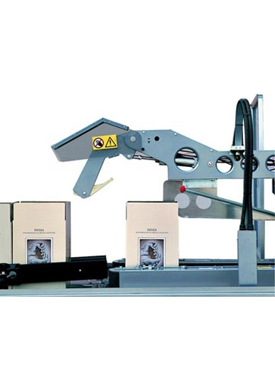 This box sealing machine is entirely automatic. It refolds the sides of the box and ends up sealing with adhesive tape the top and the bottom. The base model seals boxes with adhesive tape while the top model seals boxes with glue. Production up to 800 boxes/hour or 5000 bottles /hour.
