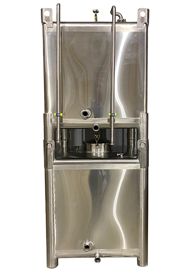 Cuve carrée empilable pour entreposage de produits. Faite d’acier inoxydable 304, elle peut contenir 1000 L. Conçue pour être manipulée avec un chariot élévateur, elle est munie d’un trou d’homme de 12" de diamètre sur le dessus et d’une boule de lavage.