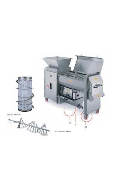 Construit en acier inoxydable 304, cet égrappoir/fouloir est équipé d'une trémie de réception de la vendange. Il est également équipé d’un lecteur de changement de vitesse ainsi que le tout nouveau système de réglage du panier « augmenter ou réduire la distance entre le tambour batteur et le panier ». Ce système permet de personnaliser l’égrappage selon la variété de raisin en cours de traitement. Un panier perforé laisse tomber les raisins égrappés entre deux rouleaux en caoutchouc réglables où ils sont délicatement écrasés et ensuite conduits à la sortie par une vis sans fin. Les rouleaux en caoutchouc sont mobiles et peuvent être inclinés pour faciliter le lavage. Son tambour batteur et son bassin à moût sont amovibles. Facilitant ainsi le nettoyage.