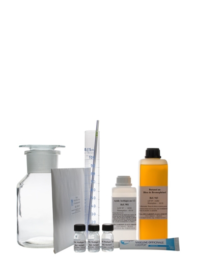 Nécessaire complet pour chromatographie sur papier. Il comprend un flacon avec rodage, une pochette de papier pour chromatographie, une micro-pipette, les réactifs et les flacons témoins.